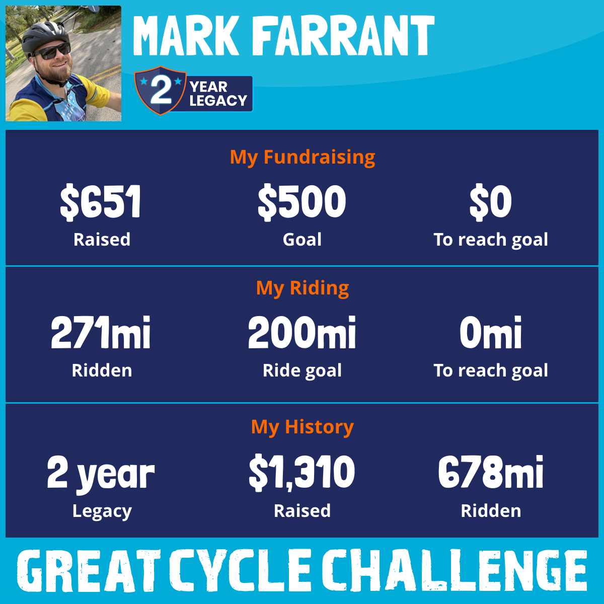 My dad Anthony has been living with cancer for nine years now. When we found out he was diagnosed with stage 4 small cell lung cancer they said he only about an 11% chance to live. Thanks to some experimental treatment research funded by these types of events and the good people that donate, he is still here and my kids get to know their PawPaw. This is why I’m riding.