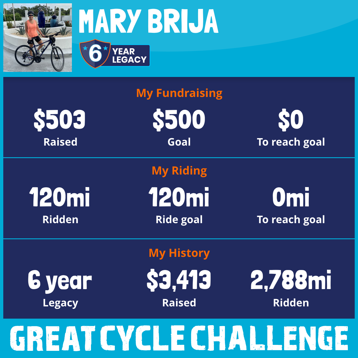 This September will be my 6TH YEAR taking part in the Great Cycle Challenge to fight kids' cancer! To date, I have ridden 2668 miles and have raised $2910 for this cause.