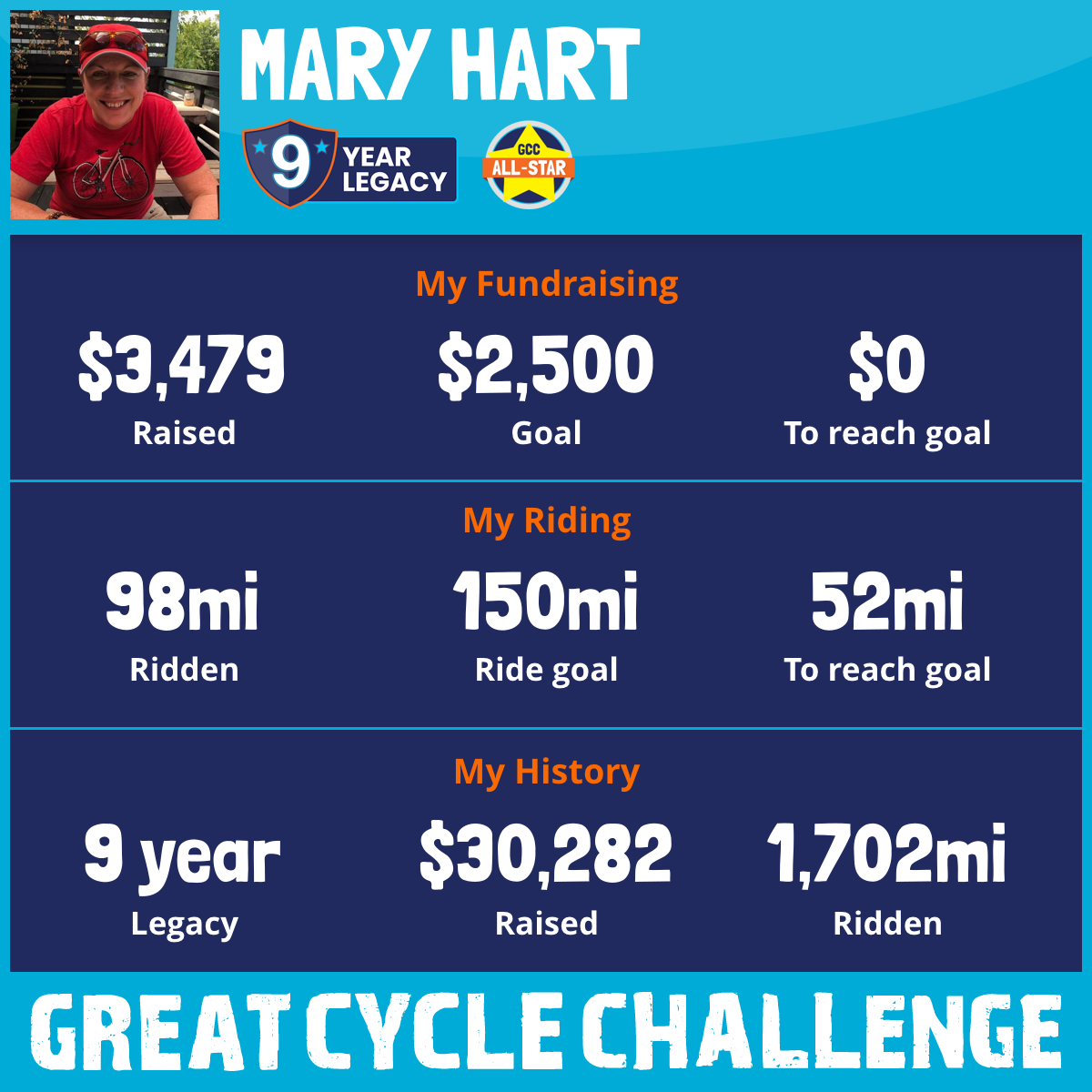 98 mi Ridden$3,479 Raised2025