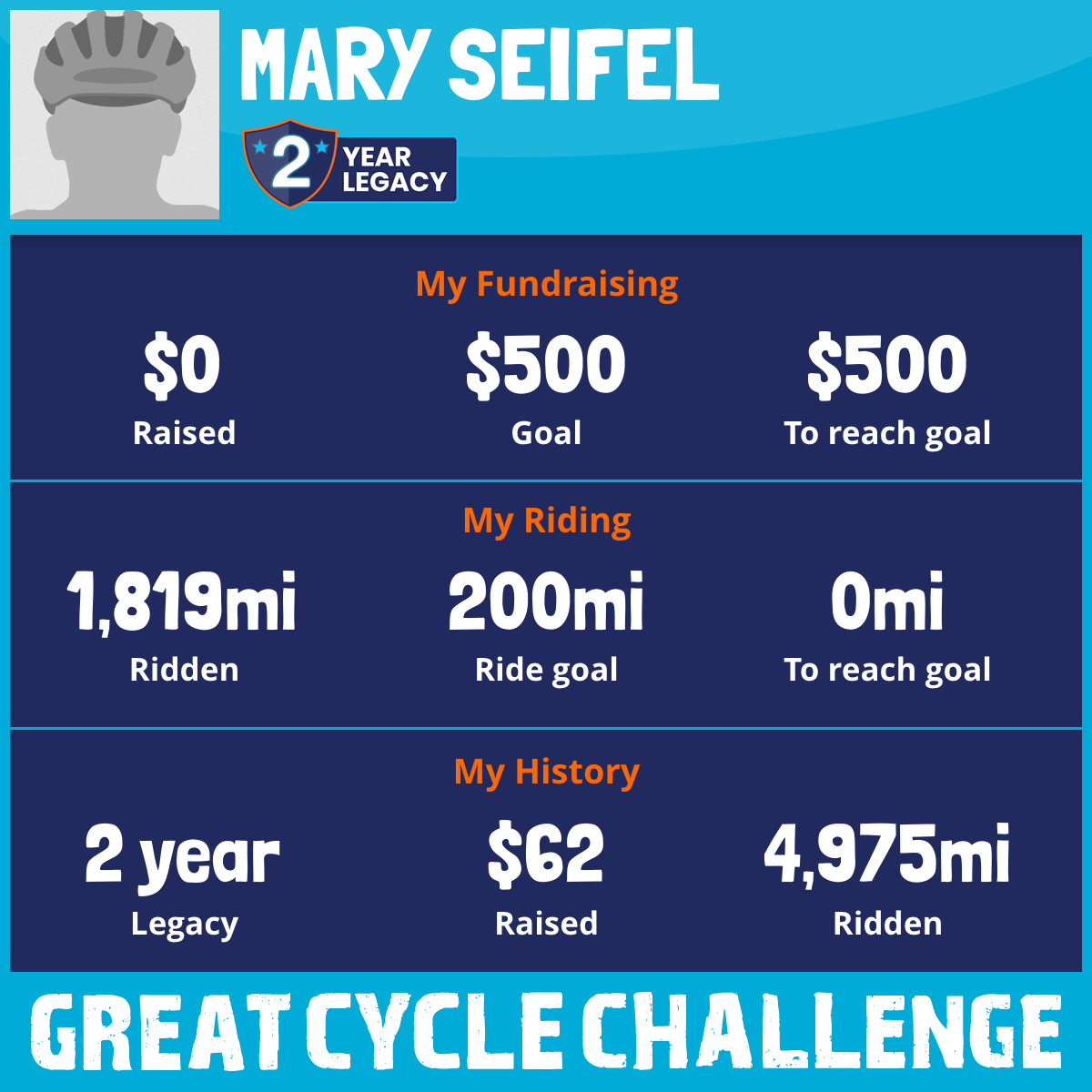 I am riding 200 mi in memory of Margaret Seifel. Please sponsor me and support my challenge to fight kids' cancer and save little lives.