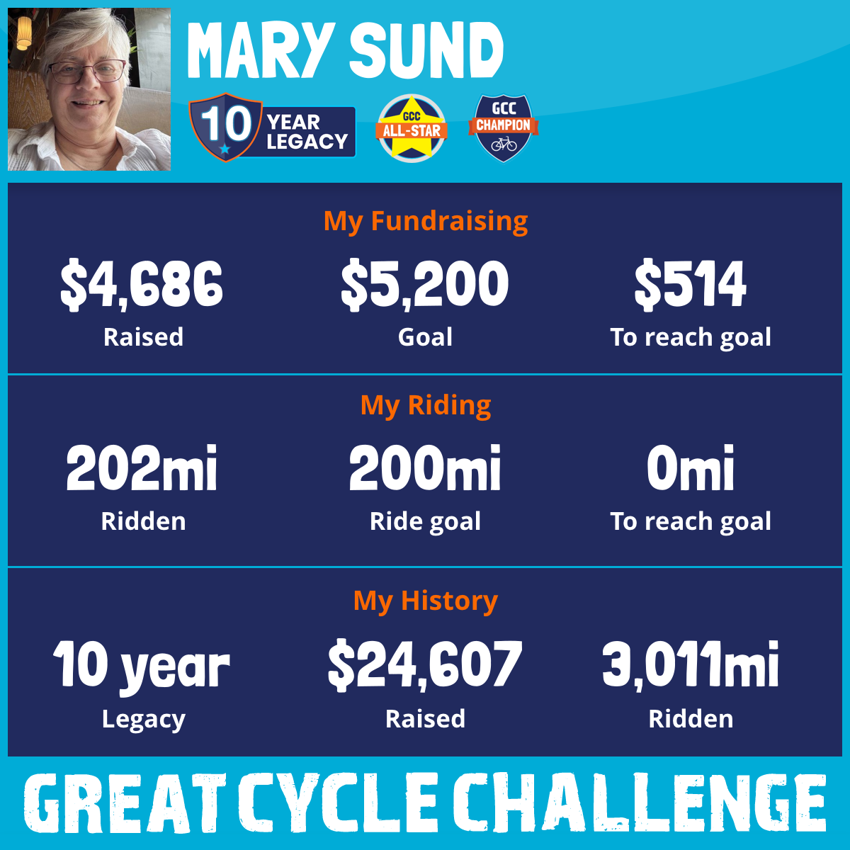 This year, I am riding on my exercise bike. I fell in July and broke my right wrist and didn’t realize it was broken for a few weeks, so now it will be in a splint and I can’t safely ride my bike outside. But I am still determined to put in the miles and raise the money for children’s cancer .