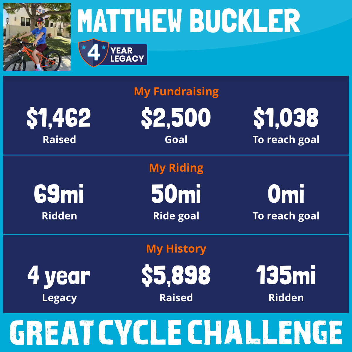 For the 4th consecutive year, I will be representing Matthew's Team and riding my bike in honor of my Uncle Matthew who bravely fought cancer. I will never forget him and will continue his legacy, especially helping kids with cancer, which was something very important to him. Read more about our story at team-matt.com or on our Facebook page at www.facebook.com/groups/mattsteam