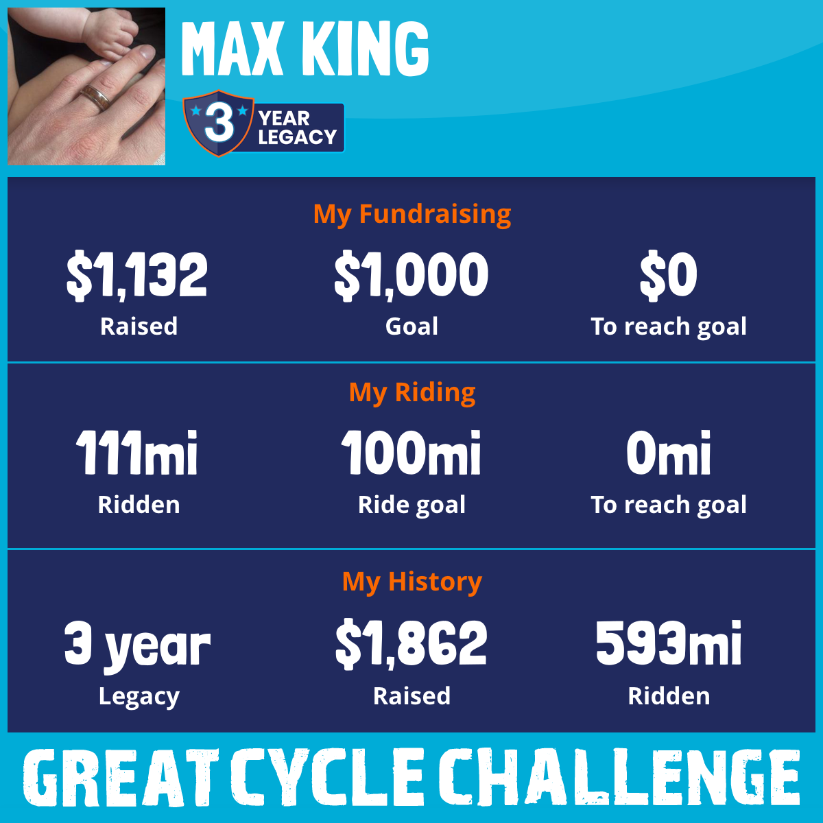 When I first signed up for the Great Cycle Challenge in 2020, I saw it as a cool opportunity to challenge myself biking while also raising money for a good cause. This year I’m joining the challenge again, but with a different viewpoint and life experiences. In 2022, I watched my dad battle cancer for a year, having thought we beat it and he was in remission, only to lose him four months later. I sat with him at his chemo appointments weekly, and although his spirits remained high, watching him lose strength and his body breaking down was hard. My other big life event was becoming a father this year. In just a few short months, it’s crazy how much you can love a child and she’s got me wrapped around those tiny little fingers.