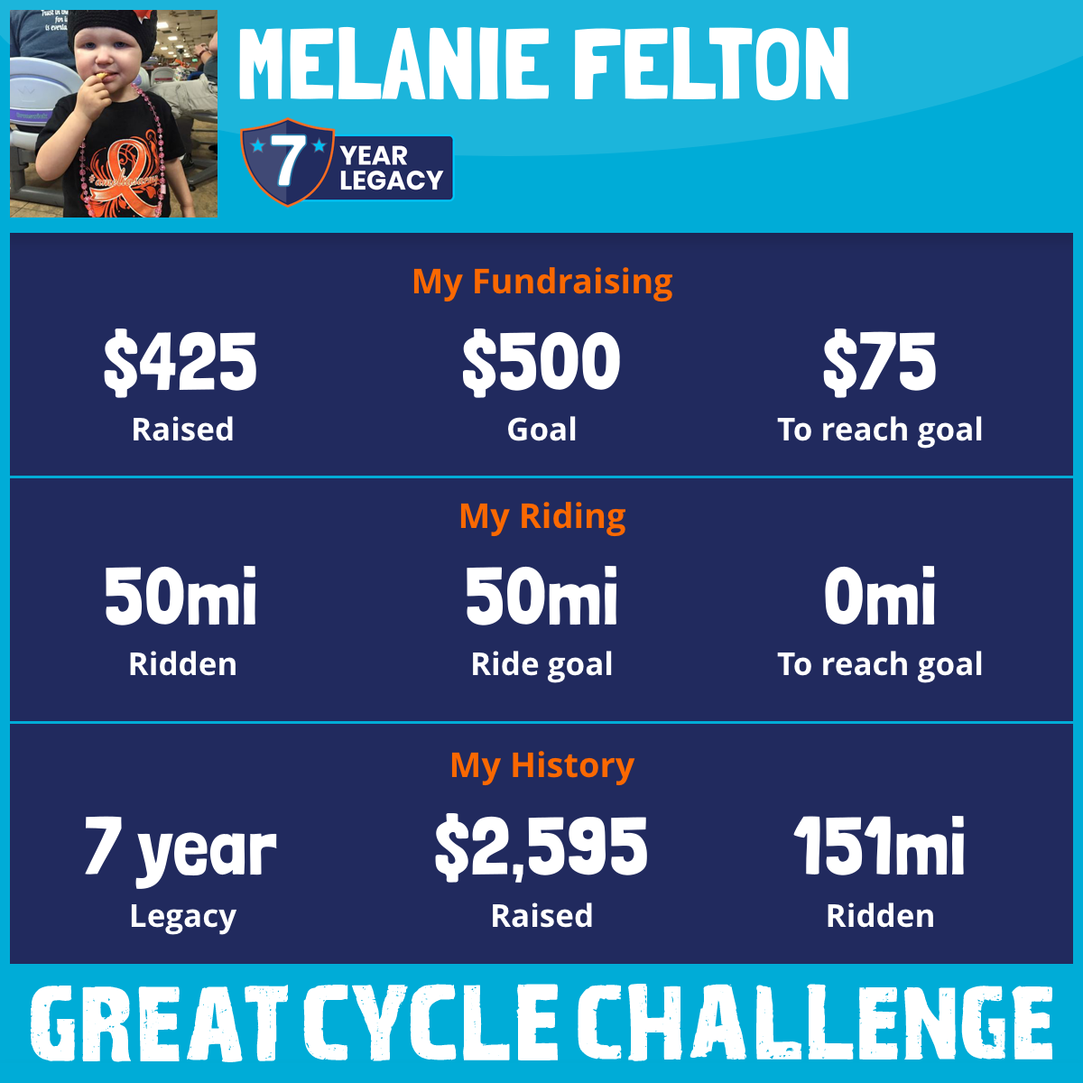 I am riding in memory of my granddaughter, Amelia. She battled leukemia twice including chemo induced brain trauma where she had to learn to walk, talk and eat again. Her fight ended when she went to dance with Jesus in March 2019. We miss her like crazy and want to support pediatric cancer research to help our little ones win their battles!