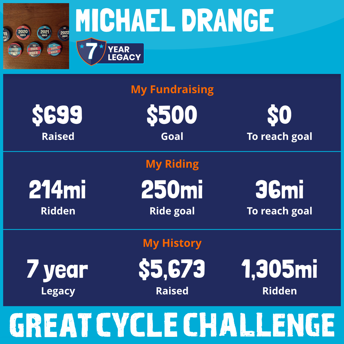 This September I will be riding in my sixth Great Cycling Challenge to help fight kids cancer. My goal is to log 250 miles. I hope you will support me in the fight against children's cancer.