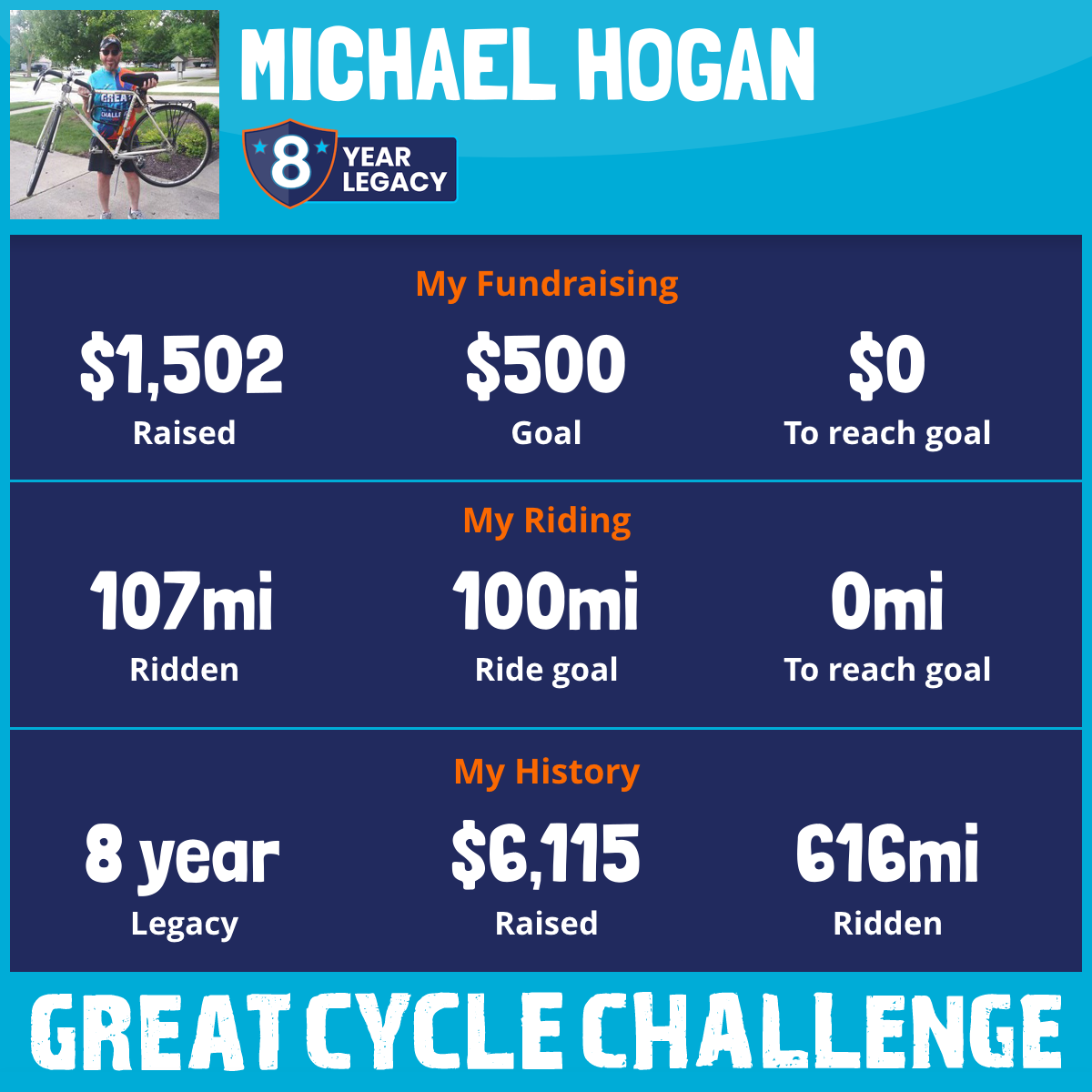 This September, I am taking part in the Great Cycle Challenge to fight kids' cancer! This is my sixth year. Unfortunately, this year I will be doing my low mileage riding on an exercise bike due to recent hip replacement surgery.