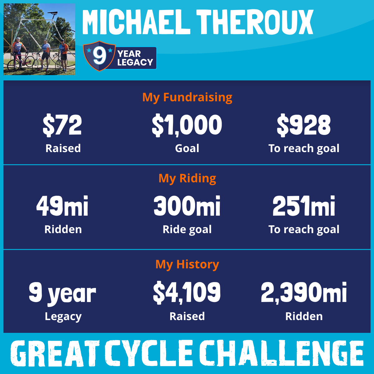 I am riding 300 mi in memory of Everyone Battling. Please sponsor me and support my challenge to fight kids' cancer and save little lives.