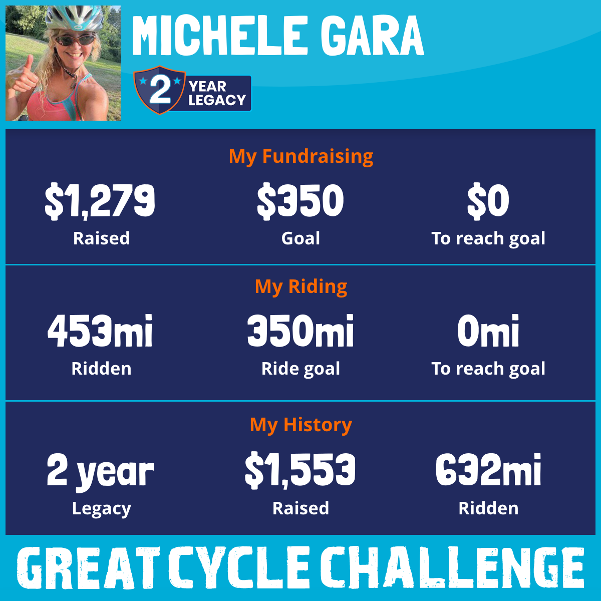 I am riding 350 mi in memory of my loved one, Dolores Mae Gara; Michael Gara; Sharrie Grady; Bob Grady; Deidy Forte; Margaret Wrydra. Please sponsor me. Thanks!