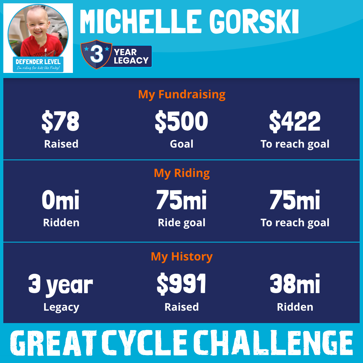 I am riding 75 mi for my dad, Anyone and everyone impacted by Cancer. Please sponsor me and support my challenge to fight kids' cancer and save little lives.