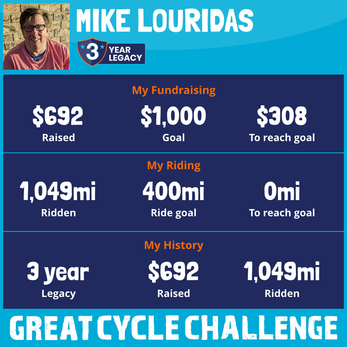 I am riding 400 mi in memory of George Louridas my brother. Please sponsor me and support my challenge to fight kids' cancer and save little lives.