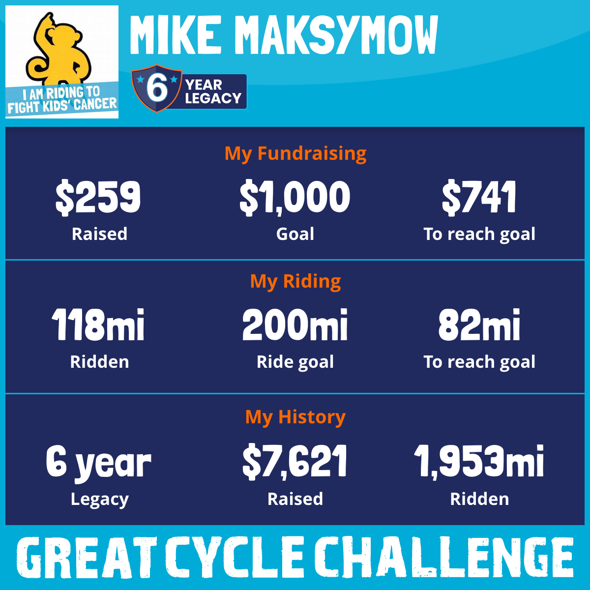 I am riding 200 mi for All courageous children stricken with this horrid disease!!!. Please sponsor me and support my challenge to fight kids' cancer and save little lives.