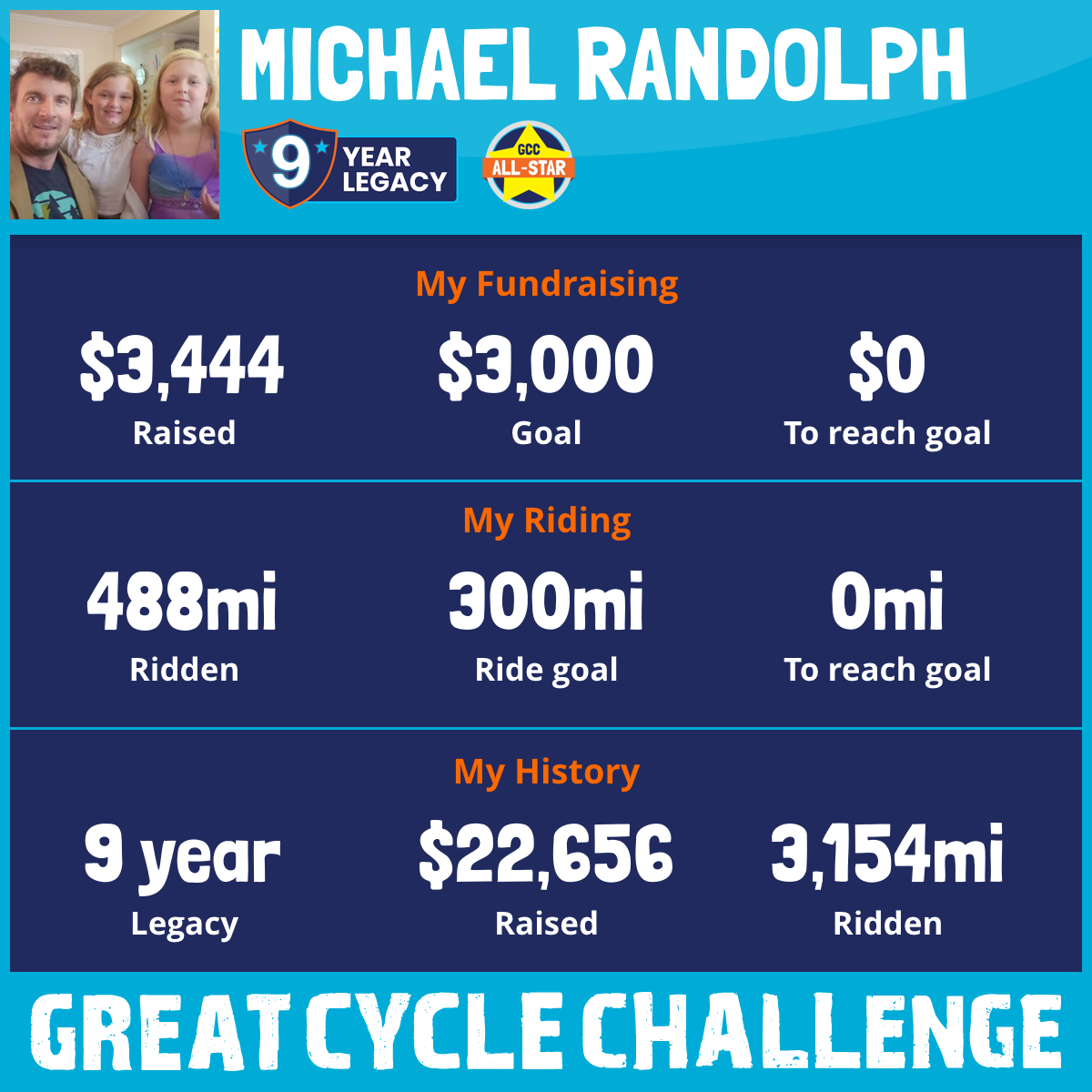 This September, I am taking part in the Great Cycle Challenge to fight kids' cancer! I have ridden the past 7 years and loved it. This year I'm riding for my kids... grateful for their health... and for parent's facing a challenge I can't even imagine. Kudos to the parents who are a rock for their kids facing impossible odds. I can't even fathom your strength... fight on sweet familes, fight on.