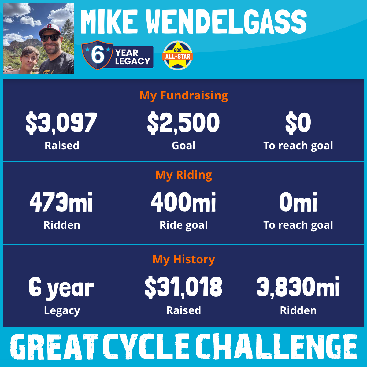 I am riding 400 mi for Dylan Wendelgass. Please sponsor me and support my challenge to fight kids' cancer and save little lives.