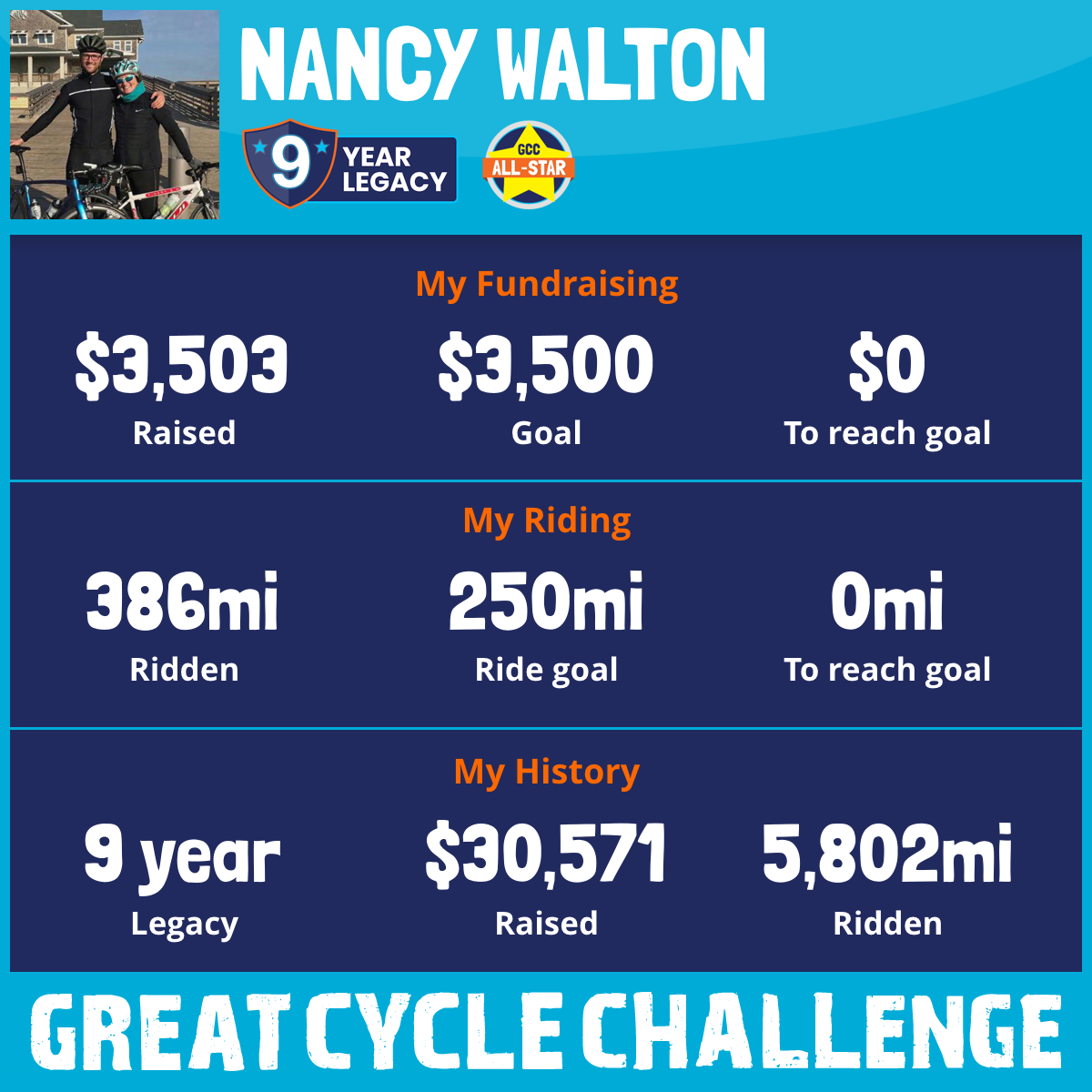 This September, I am taking part in the Great Cycle Challenge to fight kids' cancer! I have participated for the past 8 years and with your generous support I have cumulatively raised over $27,000.00! YOU are making a difference and I thank you!