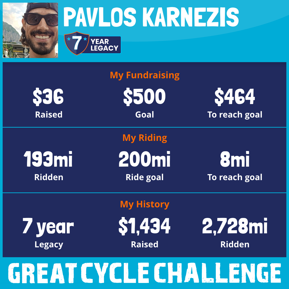 I am riding 200 mi in memory of Kosmas Garderis. Please sponsor me and support my challenge to fight kids' cancer and save little lives.