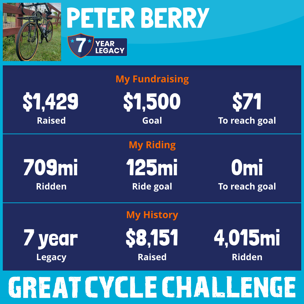 I've been riding for the GCC for about 6 years now even before I was diagnosed with stage 4 metastatic cancer and continue to ride and try to raise money for the cause.