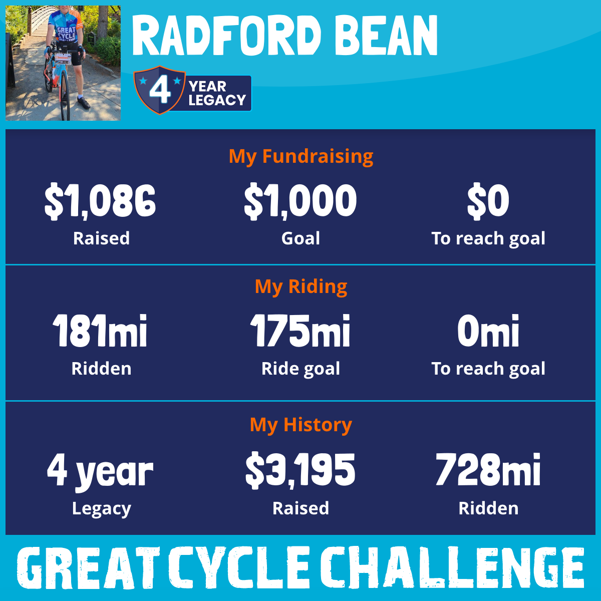 Now I'm going to be honest with you. I hadn't planned on riding this year because I got tired of begging for money in support of kids' cancer research. In addition, I had knee surgery in early March that made me question if I was up for riding a long distance during September. But canceling federal funding for kids' cancer research seemed cruel to me, especially given how wealthy America is, so I felt the need to ride again this year.