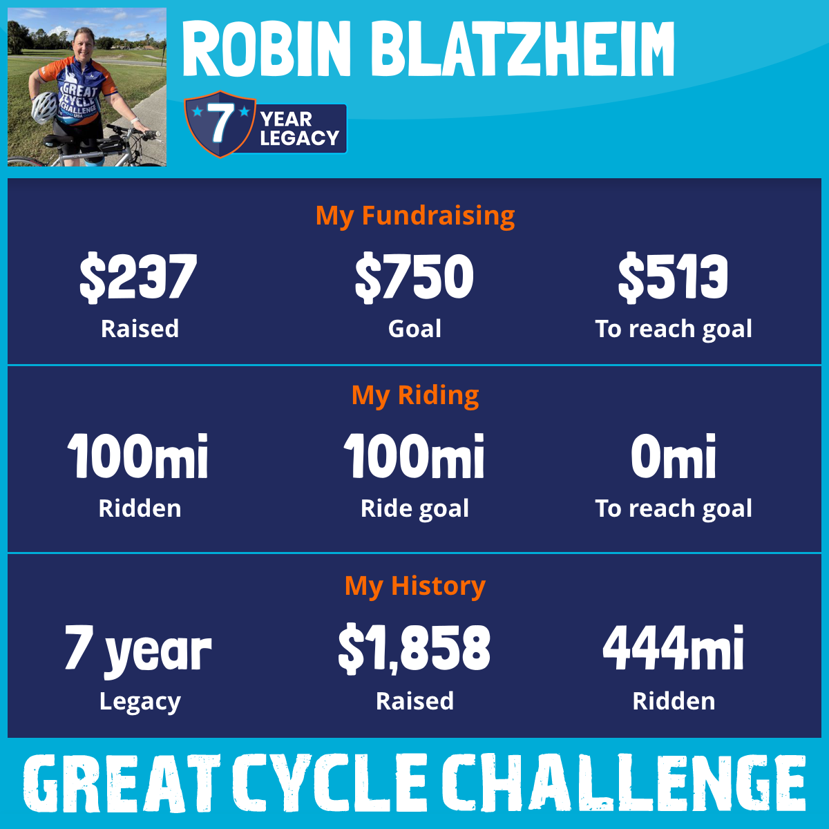 28 Sep 2025Today completed this year’s ride commitment but not without some challenges. I was physically ill for the beginning of the Great Cycle Challenge and out of town for week, however, the Great Cycle Challenge is that important I was determined more than ever to complete my 100 miles this year. Due to Federal funding cuts it is only through funding raising like this that finding cures for Pediatric Cancer can happen. Please it is now your time to shine and help a child like Brooke fight to beat Pediatric Cancer. #BraveLikeBrooke