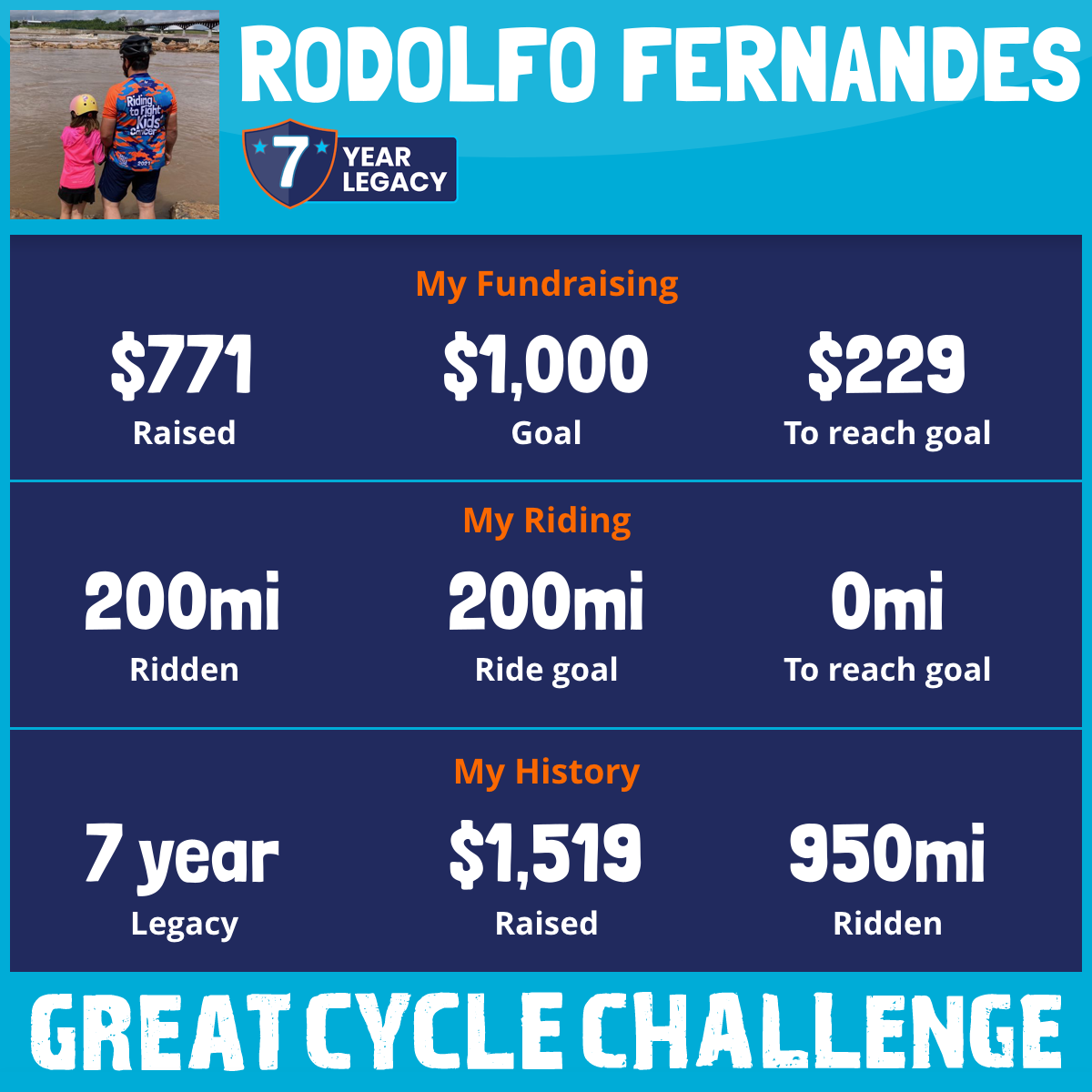 I am riding 200 mi for Everyone. Please support my challenge by donating to fight kids' cancer and save little lives.