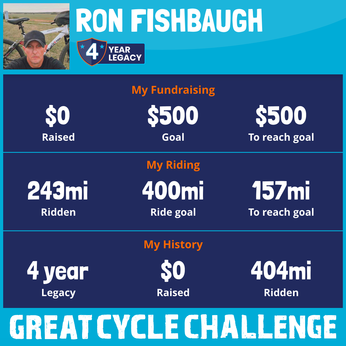 I am riding 400 mi in memory of Wyatt Schmaltz. Please sponsor me and support my challenge to fight kids' cancer and save little lives.