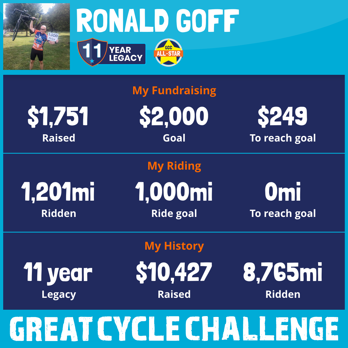 1,201 mi Ridden$1,751 Raised2025