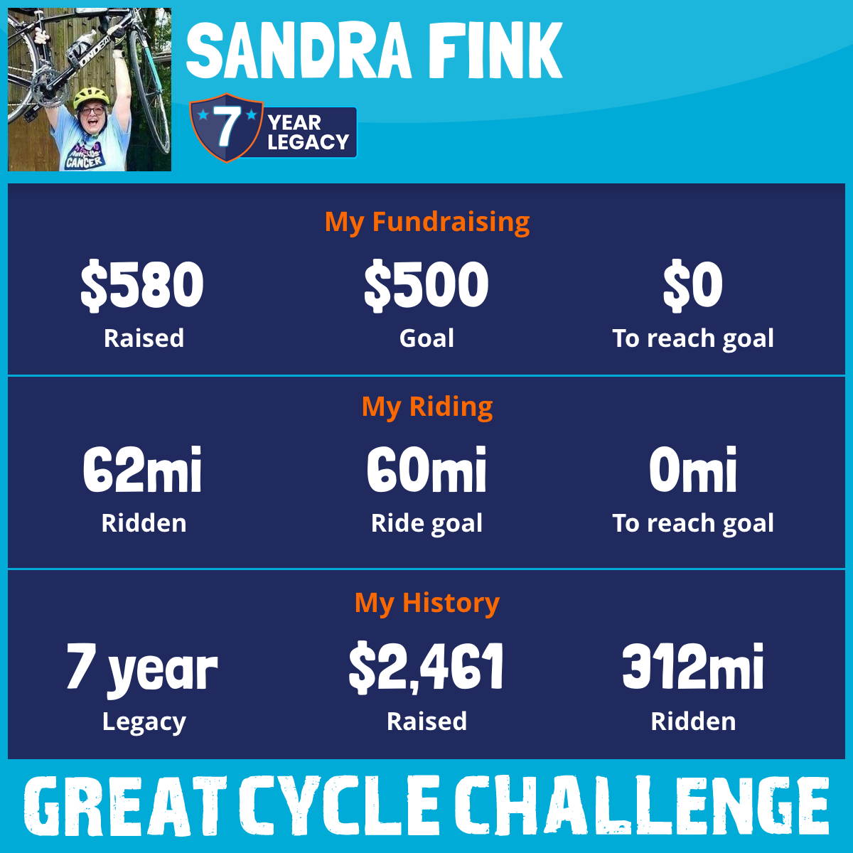 This will be my 7th tear I've participated in the Great Cycle Challenge for to raise awareness as well as donations for this important cause. I would be so grateful if you would support me in this challenge by making a donation today.