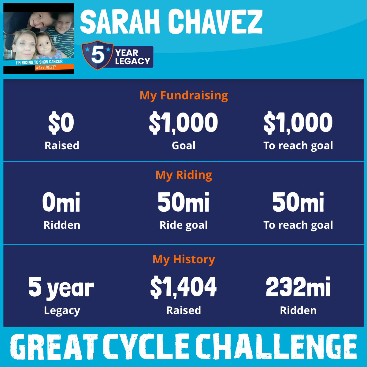 I am riding 50 mi to fight kids' cancer and save little lives. Please sponsor me to support my challenge!
