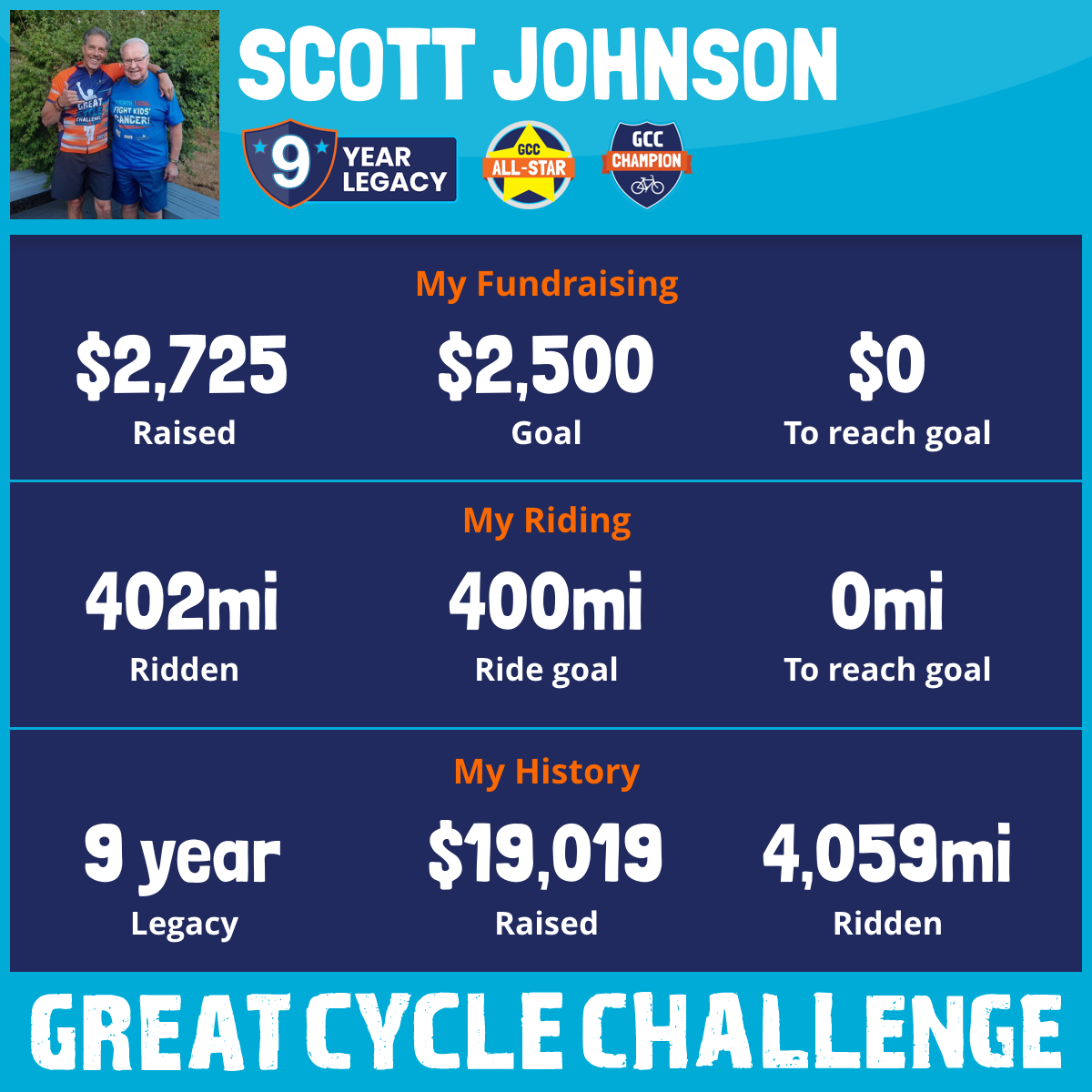 🚴♂️ Why I Ride: A Personal Challenge Turned Lifelong Mission Nine years ago, a friend challenged me to join the Great Cycle Challenge—and I accepted. What began as a simple dare has since transformed my life and deepened my commitment to fighting childhood cancer. Last year, my father was diagnosed with cancer. When it hits home, the reality of this disease becomes even more painful. It’s a reminder that cancer doesn’t discriminate—and no one should have to live fighting it. This year, I’m dedicating my ride to my dad and to every child battling this life-threatening illness. These kids deserve the freedom to play, laugh, and live fully—just as we enjoy the freedom to pedal. 💪 Join Me. Ride With Me. Make a Difference. If you have a bike—or have ever thought about getting one—this is your moment. Become part of a movement of everyday heroes who are changing lives one mile at a time. 👉 Click here to join or donate to my ride: https://greatcyclechallenge.com/Riders/ScottJohnson. I promise you won’t regret it. Let’s ride for hope, for healing, and for every child who deserves a future. #GCCUSA
