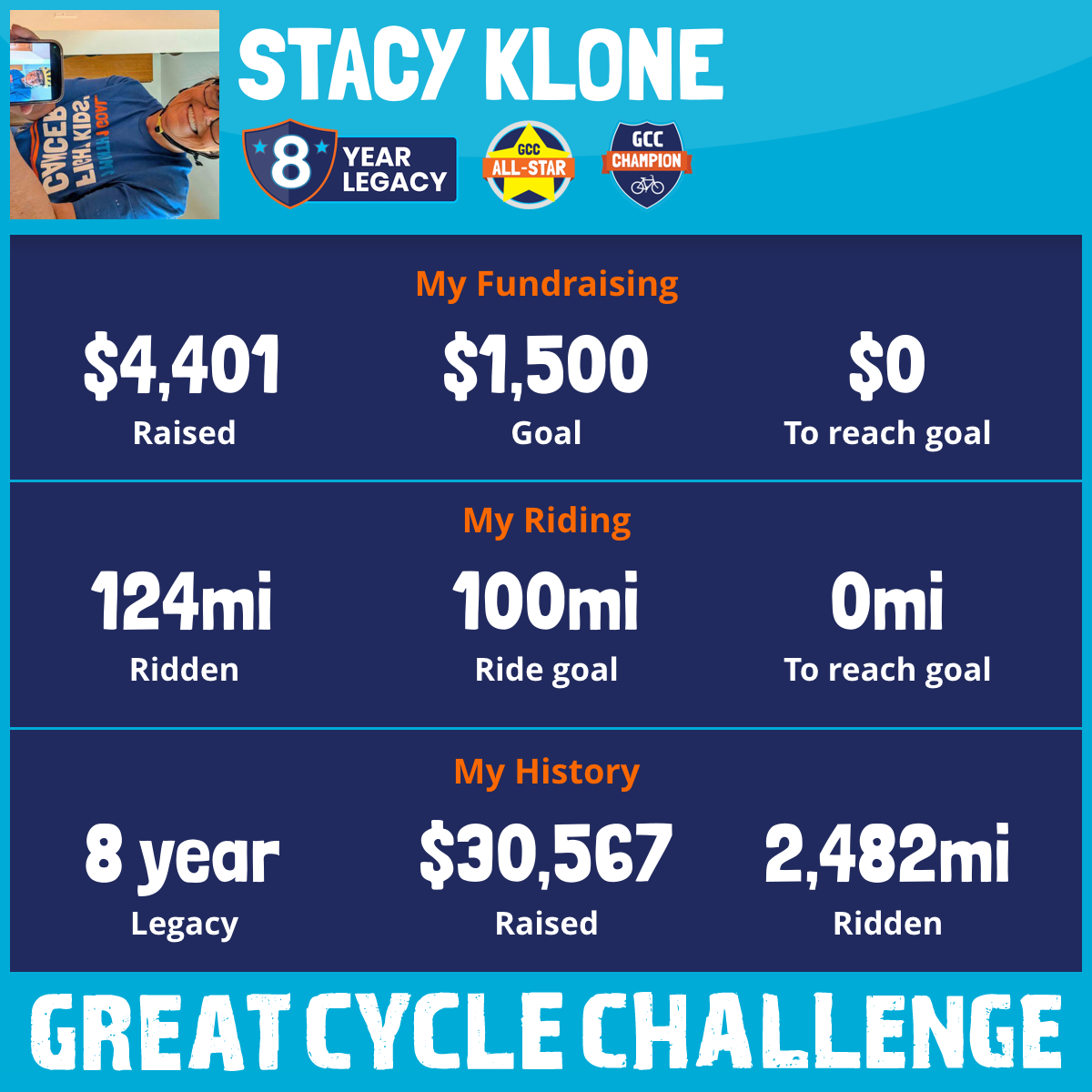 My fundraising site is live but will only be open until September 30, giving us limited time to reach our goal. The Great Cycle Challenge (GCC) offers riders incentives to earn ride jerseys, and I aim to start my first ride wearing my very own Great Cycle Challenge USA 2024 jersey. To earn this, I need to raise $500. Every single dollar can and will make an impact in helping kids get back to living their lives instead of fighting for them!