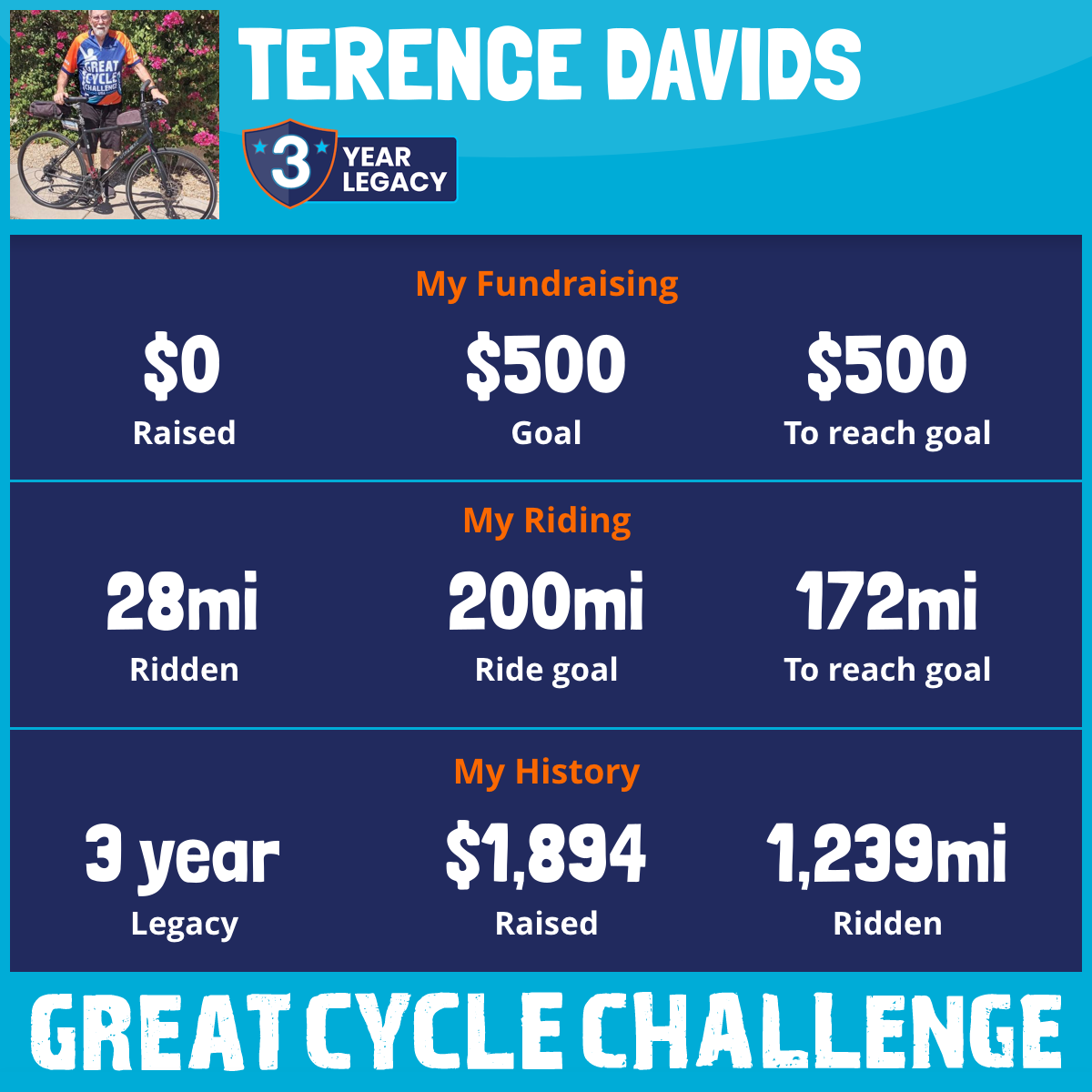 I was flirting with the idea of joining the Great Cycle Challenge for Children’s Cancer some years ago when something got in the way. I got a cancerous tumor on my spine that paralyzed my legs. After Chemo, Radiation and Rehab, it’s taken me 3-1/2 years to get back on the bike, and I decided this would be the time to join the Challenge. I don’t want to see children go through what I did. I’m going to try to do at least 400 miles, (and hopefully more) in September. I would appreciate your support in this endeavor and the kids would get the benefits.