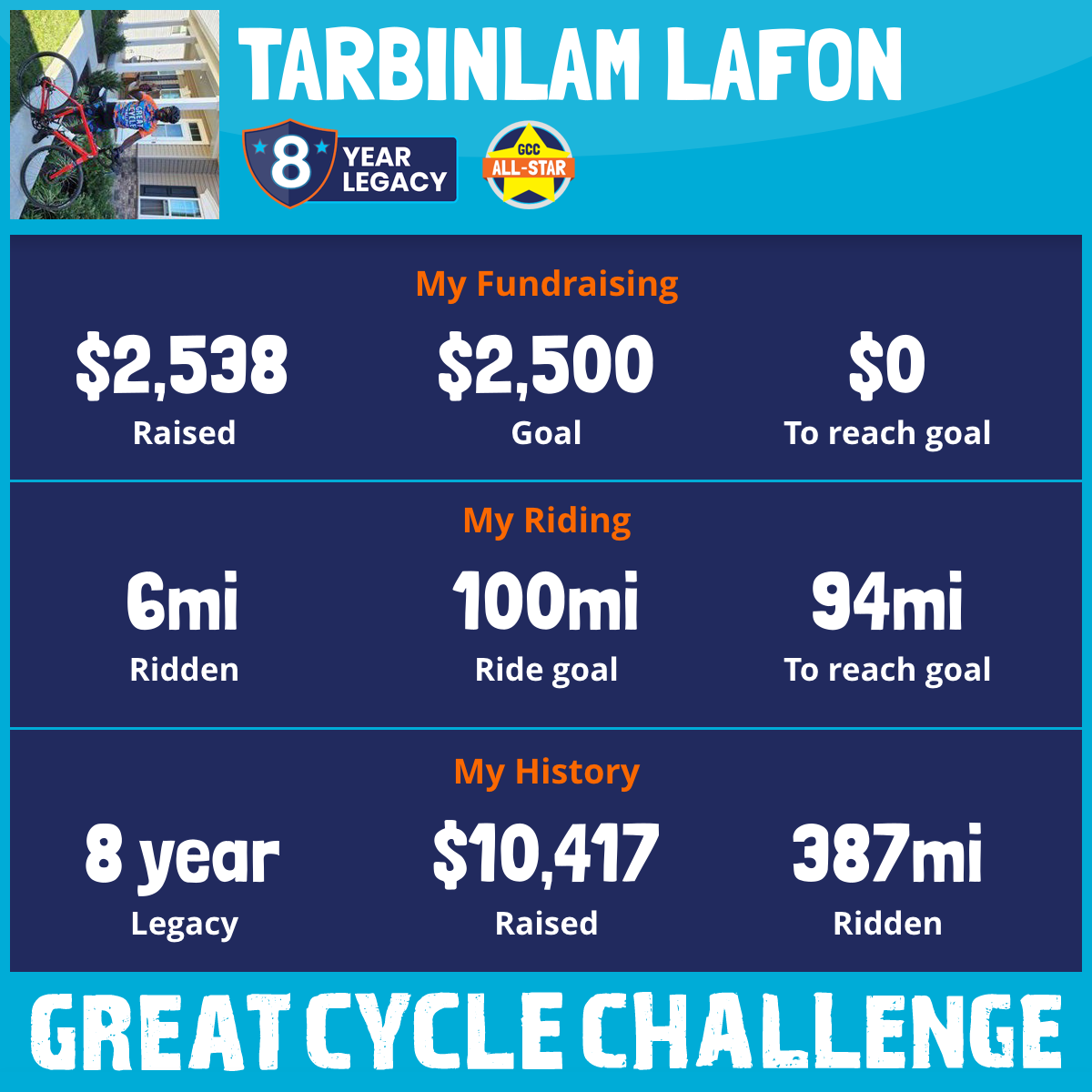 I am riding 100 mi in memory of For all the members of the Lafon, Nguni, Che and friends' families who've been affected by cancer. Please sponsor me and support my challenge to fight kids' cancer and save little lives.