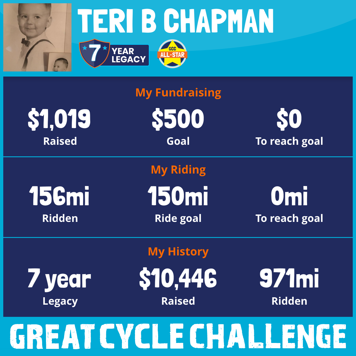 I am riding again in memory of my brother, Timmy Tilly. My brother died of age of 4 from leukemia. I will never find the right words to explain the pain my parents went through when they buried their first born. I can’t change the past but hopefully I can change the future. Please help me raise awareness of children cancer and support me in my ride. I would appreciate it if you would donate to Children Cancer Research Fund so a cure can be found to children cancers. Thank you for your support!