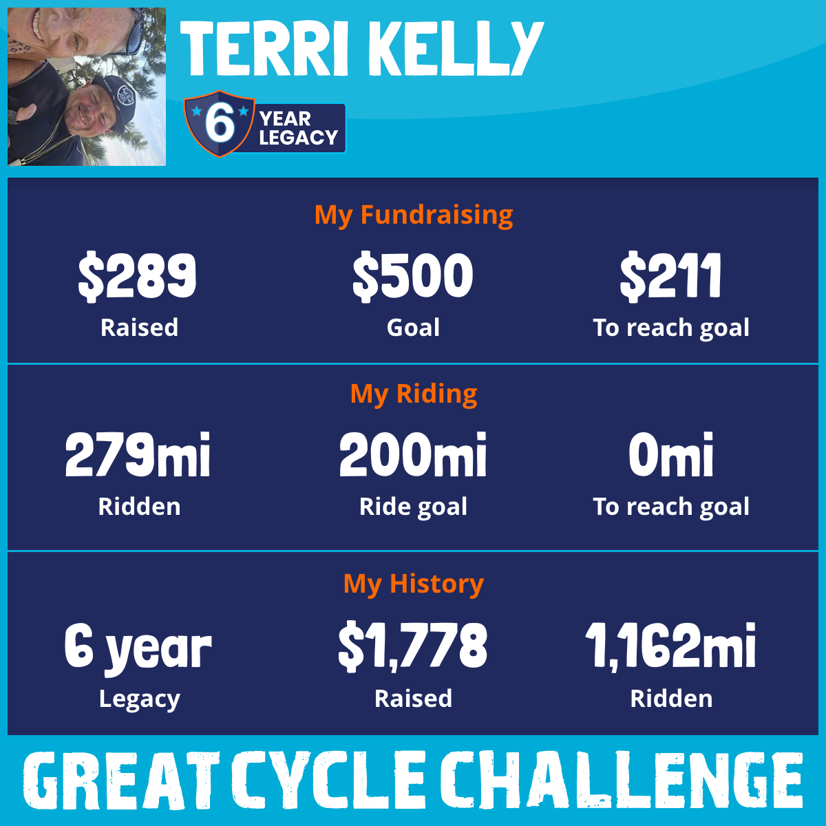 I also am riding for my husband John Kelly Who has been going through stage 4 lung cancer for the last 2 and a half years. And our son Richard Kelly who is now 35 who has been cancer-free for 30 years now. Just let's stop cancer now thanks for