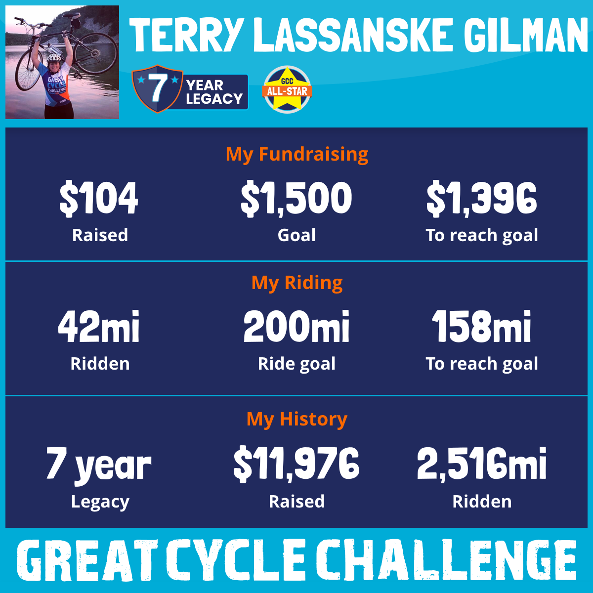 I've signed up for the 2025 Great Cycle Challenge and will be riding this September to fight kids' cancer and support research for all to fight this terrible disease! My goal is to pedal 200 miles during this time!