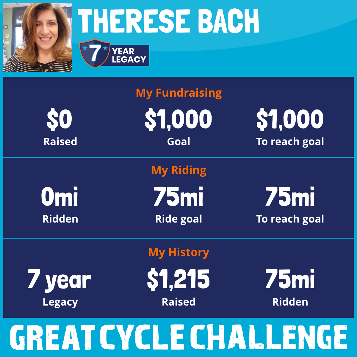 I am riding for my friend Leslie's son Kyle who is our hero as he fought with all his might but lost his battle courageously. He taught us how to love life and believe. Please consider donating.