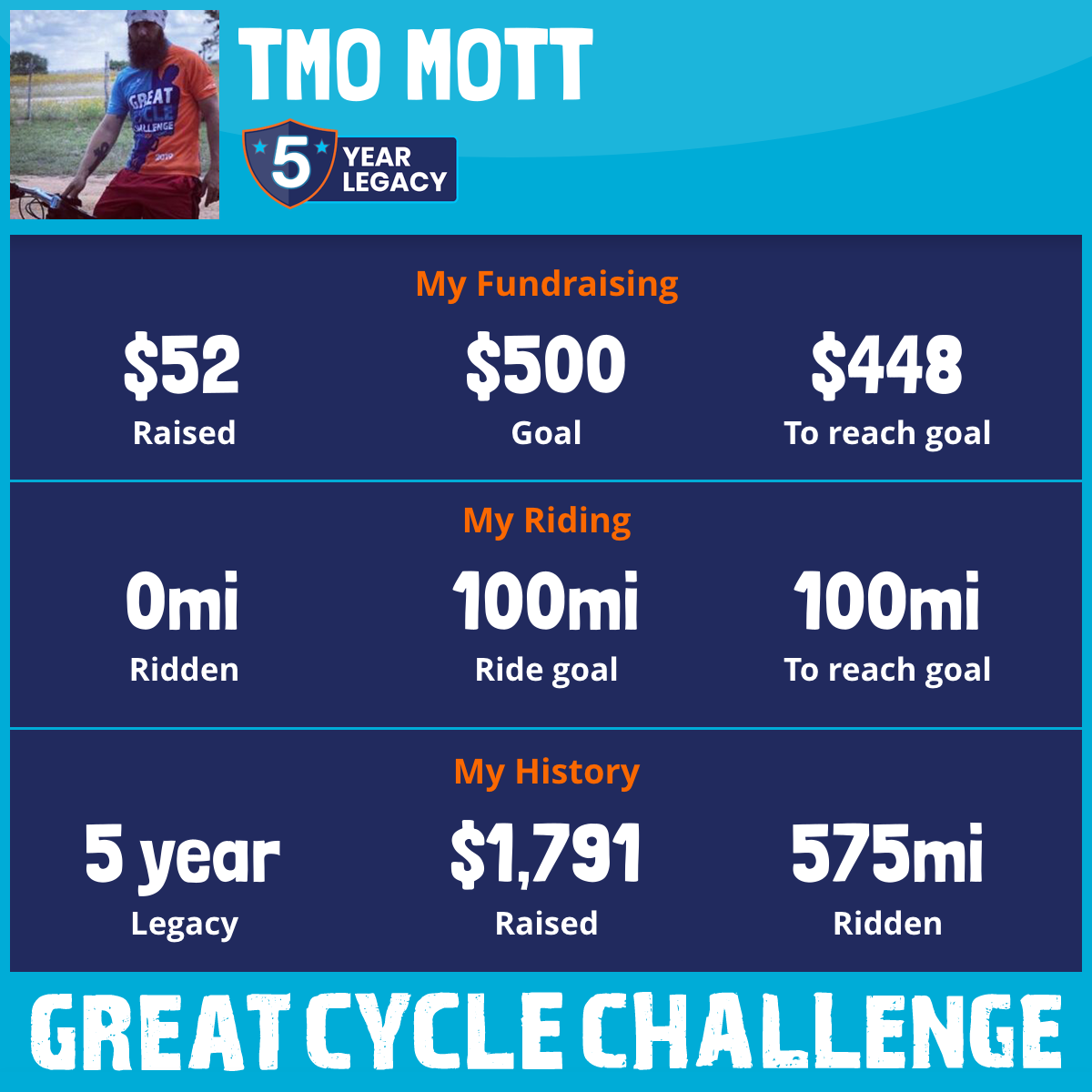 I am riding 100 mi for The world. Please sponsor me and support my challenge to fight kids' cancer and save little lives.