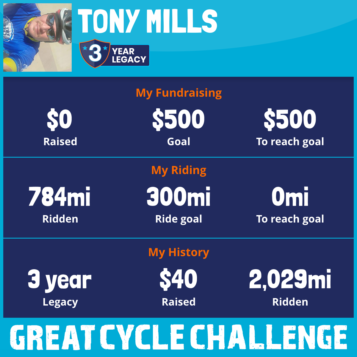 I am riding 300 mi for Tonny mills. Please sponsor me and support my challenge to fight kids' cancer and save little lives.