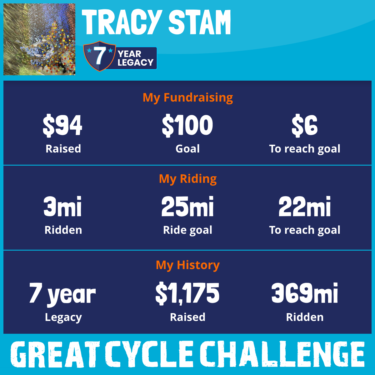 Year #7!!!! Now retired and able to enjoy the ride. I am taking part in the Great Cycle Challenge to help fight kid’s cancer.