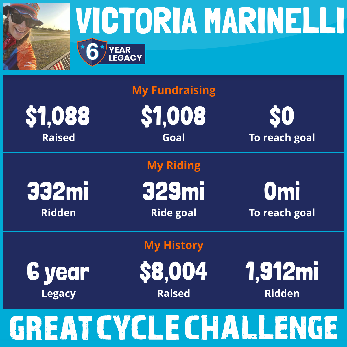 This ride is a tribute to my Dad, Brunz~he lost his fight to Pancreatic Cancer 3/29/2020, but he never quit smiling. I’m taking this challenge for you Dad, you were always coaching kids to play a great game like your life depends on it, take a chance with no fear & know your field position, be a good team mate & enjoy yourself no matter what. Live for today for a better tomorrow. Be the game changer, Vic. So I take this challenge with the hope &desire to change the future of Children’s Cancer with my team of supportive fabulous folks. My goal is to fight for these tiny fierce warriors &wake up one day & Cancer will not be a challenge kids have to face or experience. Brunz taught me to be the motivator & to never give up trying to accomplish my goals & help people achieve their goals as well while always giving “110% best you can be” &stay in the moment, focus on the people that need you most & love the most & celebrate that victory moment with a fighting spirit & be grateful for the challenge. Dad’s VIM & VIGOR was always stellar. Dad~you had that good vibe motivation during your warrior journey & it pushed me in gear to play my best game of life to seek out a group who needed my efforts to give back~today I can make a difference to give it “my all” to cycle great for these warrior kids now & for their healthy tomorrow’s. No doubt you will be with me Dad, every mile I ride for these kiddos. I know you will be the wind at my wheels, so let’s Rock&ROLL{my Dad always said that}to kick Cancer’s butt. .peace.