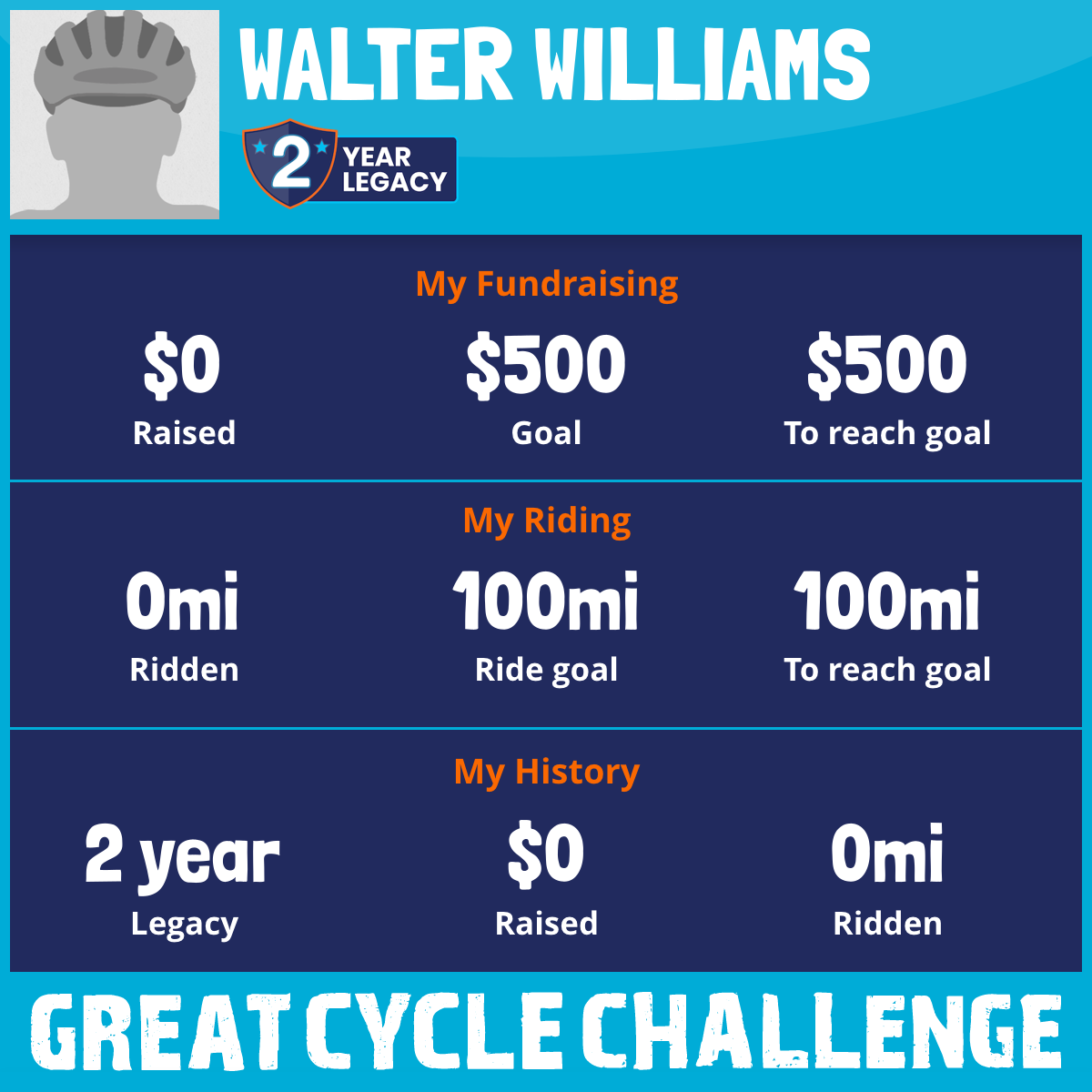 I am riding 100 mi for my brother, Walter Williams. Please sponsor me and support my challenge to fight kids' cancer and save little lives.
