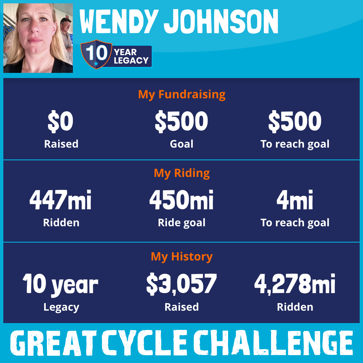 I am riding 450 mi in memory of Connie Johnson & Debbie Bergin. Please sponsor me and support my challenge to fight kids' cancer and save little lives.