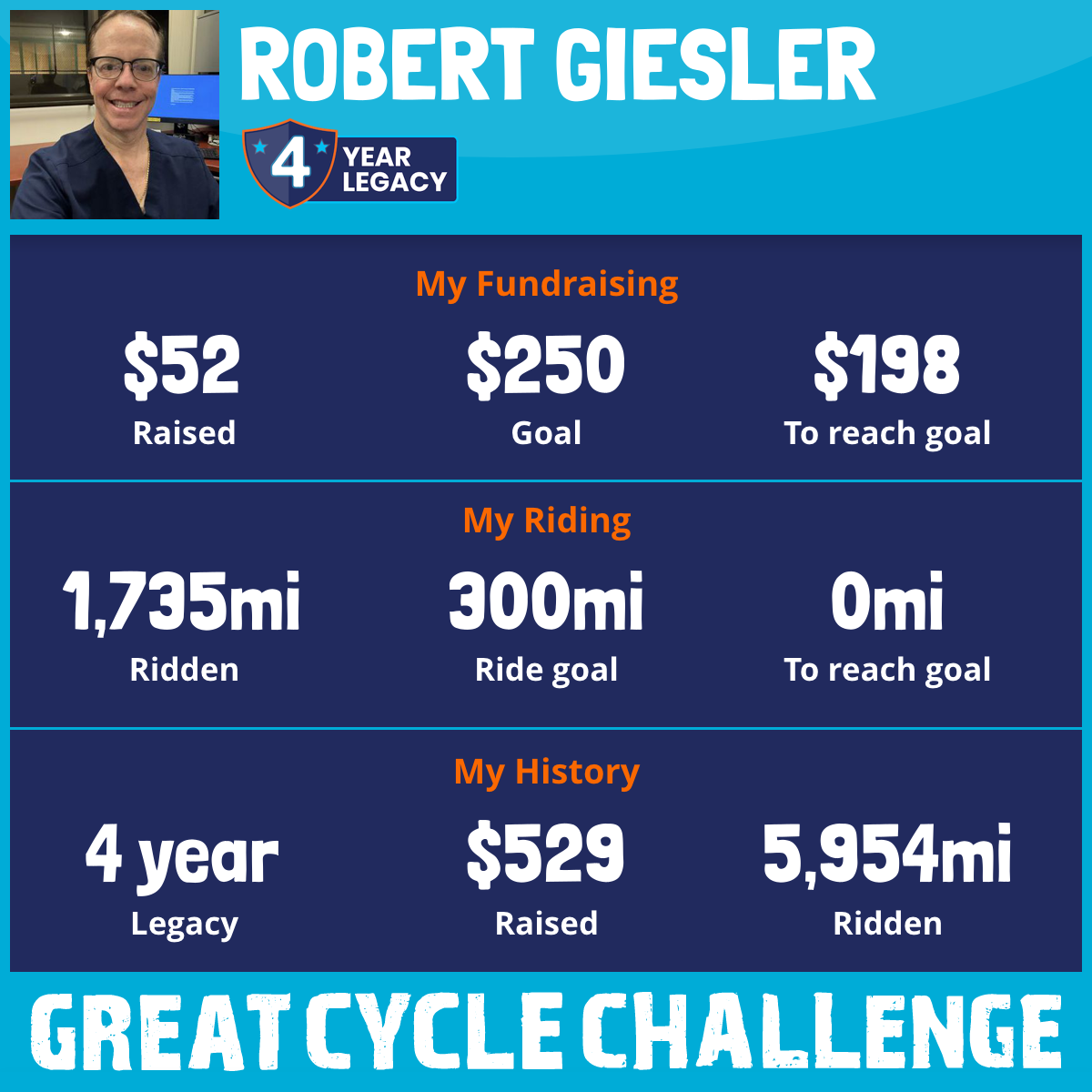 I am riding 300 mi in memory of my dad, Chuck Giesler. Please sponsor me and support my challenge to fight kids' cancer and save little lives.